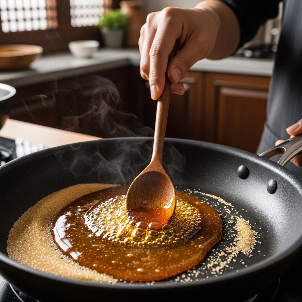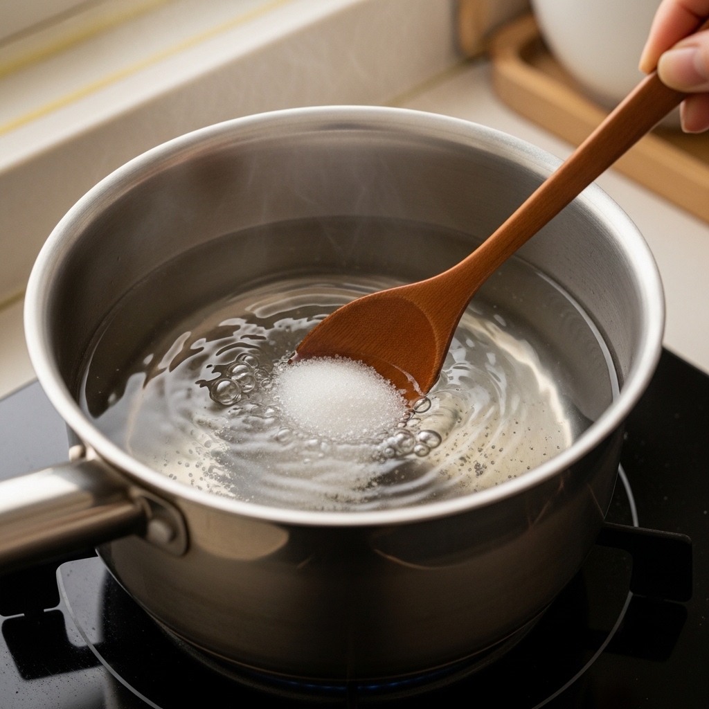 냄비에 설탕과 물을 넣고 약불에서 저어가며 설탕이 완전히 녹을 때까지 가열한 뒤 식혀 사용합니다.